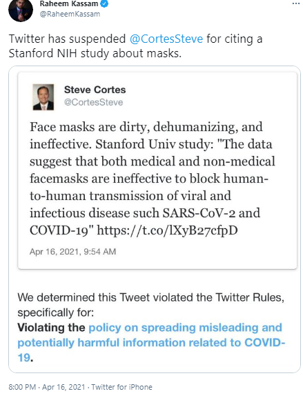 There is no benefit to wearing the facemasks, the study concluded. Yet instead of Twitter encouraging (or passively facilitating) public dialogue over this critical issue, the information is actively being suppressed.