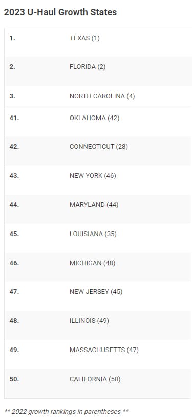 For the fourth year in a row, California reflected the largest net loss of one-way movers. Other bottom-five states for growth are Michigan, New Jersey, Illinois and Massachusetts. New York ranks 43rd.
