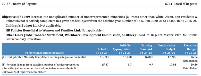 Soon after Reed’s appointment as Commissioner of Louisiana Higher Education in 2018, the Board of Regents and nearly all state universities adopted a policy objective in the Higher Education Executive Budget that openly prioritizes non-White and non-Asian students. This discriminatory objective first appeared in the FY21-22 budget (pg. 16) and has been listed every year since, including the FY25-26 budget (pg. 12).