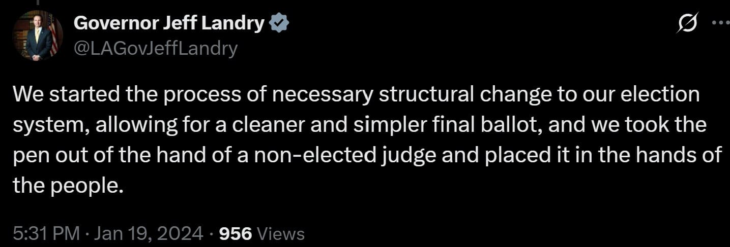 In January 2024, Governor Jeff Landry publicly supported this terrible map, endorsed this terrible map, and signed this terrible map into law. You can find the post below from Governor Landry’s official Twitter/X account following the passing of Louisiana’s current Congressional district map: