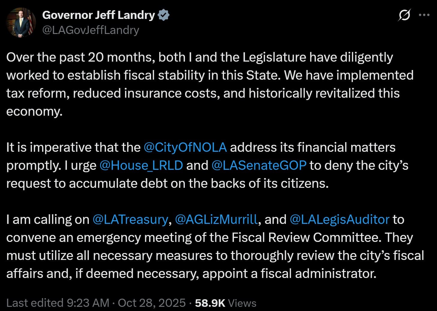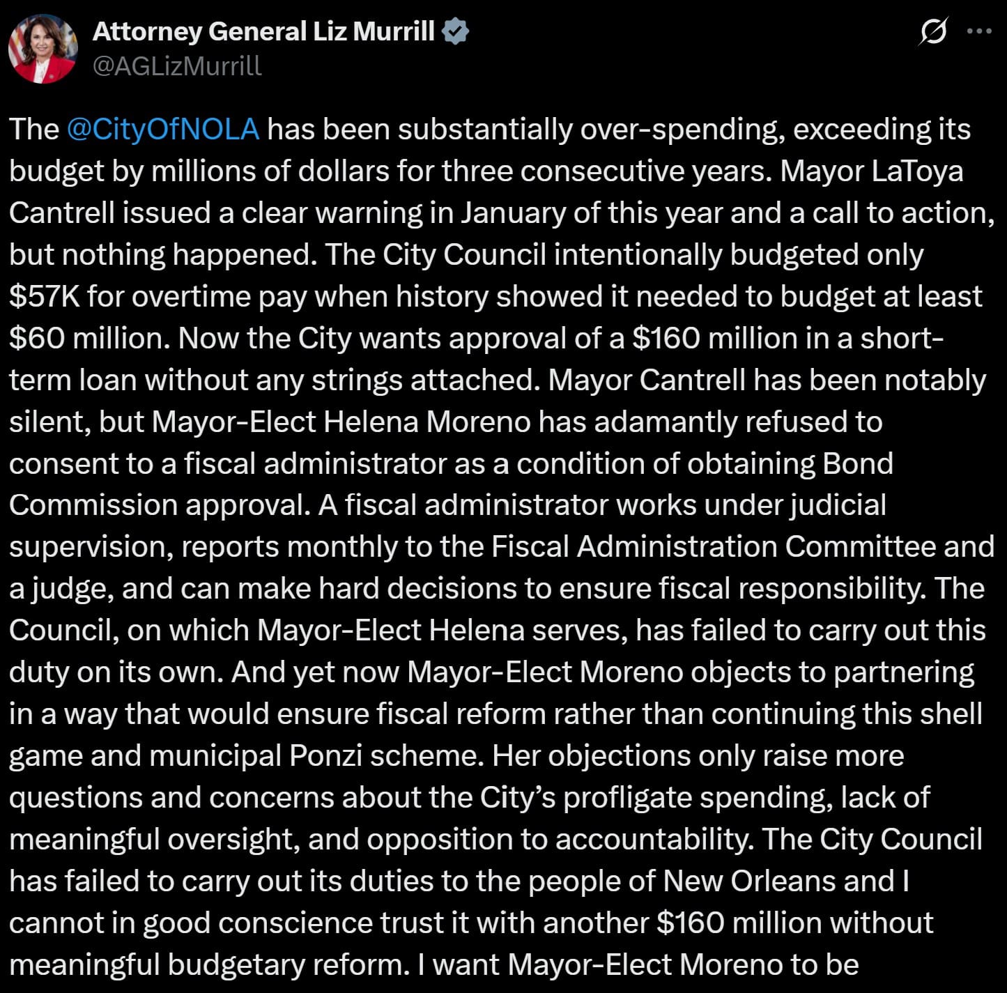 Before the meeting, Gov. Landry and AG Murrill had publicly voiced concerns about the spiraling fiscal issues in New Orleans. In fact, both Landry and Murrill explicitly requested the Commission to appoint a fiscal administrator over New Orleans in late October.