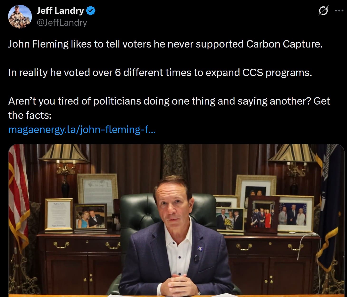 On Monday, Governor Jeff Landry published a video lambasting John Fleming by claiming – and it’s a hotly-disputed claim, to be charitable – that Fleming supports big business’s carbon capture projects.