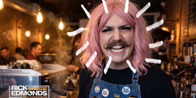 The message here is pretty good – Edmonds is running more or less as the social conservative in the race, so he’s owning that by claiming that he’s the one all the leftist freaks hate the most. A mustachioed “trans woman” with pink hair complaining that Edmonds “misgendered” him isn’t a bad way to show it.